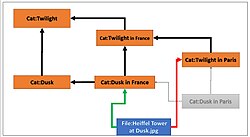 (This is an exemple) I want to categorize the file "Heiffel Tower at dusk.jpg" but I don't have and don't want to create a "Dusk in Paris" category. Should I categorize it as "Dusk in France" (green) or "Twilight in Paris" (red), or both? thanks — Preceding unsigned comment added by JotaCartas (talk • contribs) 00:33, 11 October 2025 (UTC)
